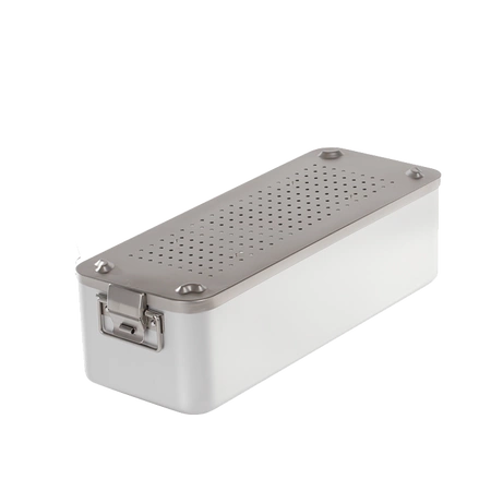 Este contenedor garantiza una protección eficaz de los instrumentos frente a la contaminación. La tapa y la base del recipiente son perforadas y equipadas con filtros de papel desechables que se reemplazan en cada ciclo de esterilización. El set incluye 100 filtros desechables, lo que asegura comodidad de uso durante un largo periodo.